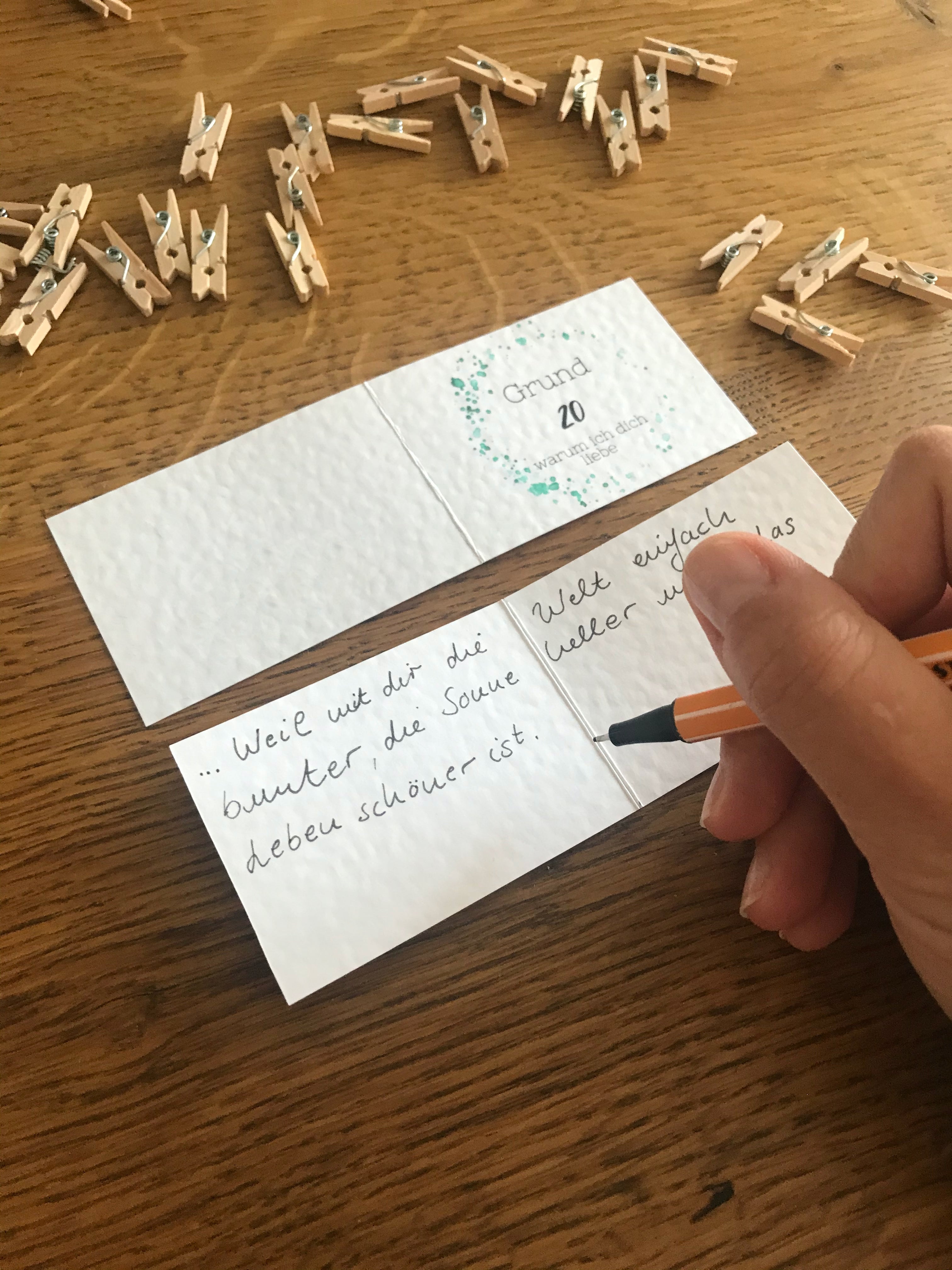 1. Beschrifte die Kärtchen mit deinen eigenen Worten – zum Beispiel mit Erinnerungen, kleinen Liebesbotschaften oder Dingen, die du an diesem lieben Menschen so schätzt.